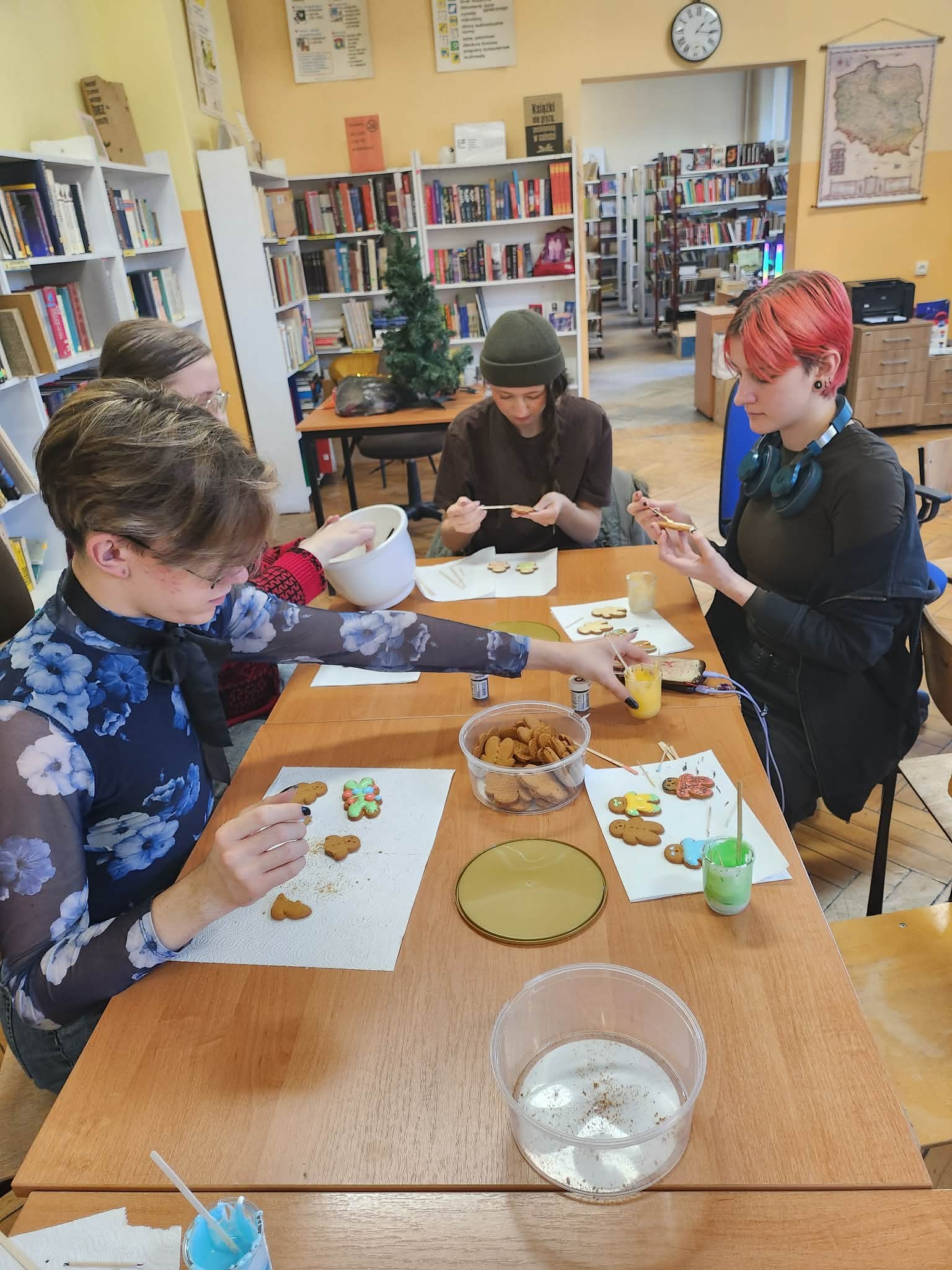 18.12.2025 w czytelni biblioteki Zespołu Szkól Nr 1 odbyły się warsztaty zdobienia pierniczków świątecznych. Uczniowie wraz z nauczycielami mogli wykazać się kreatywnością w wykorzystaniu lukru wykonanego samodzielnie. „Ja pierniczę, Ty pierniczysz, Oni pierniczą!!!”