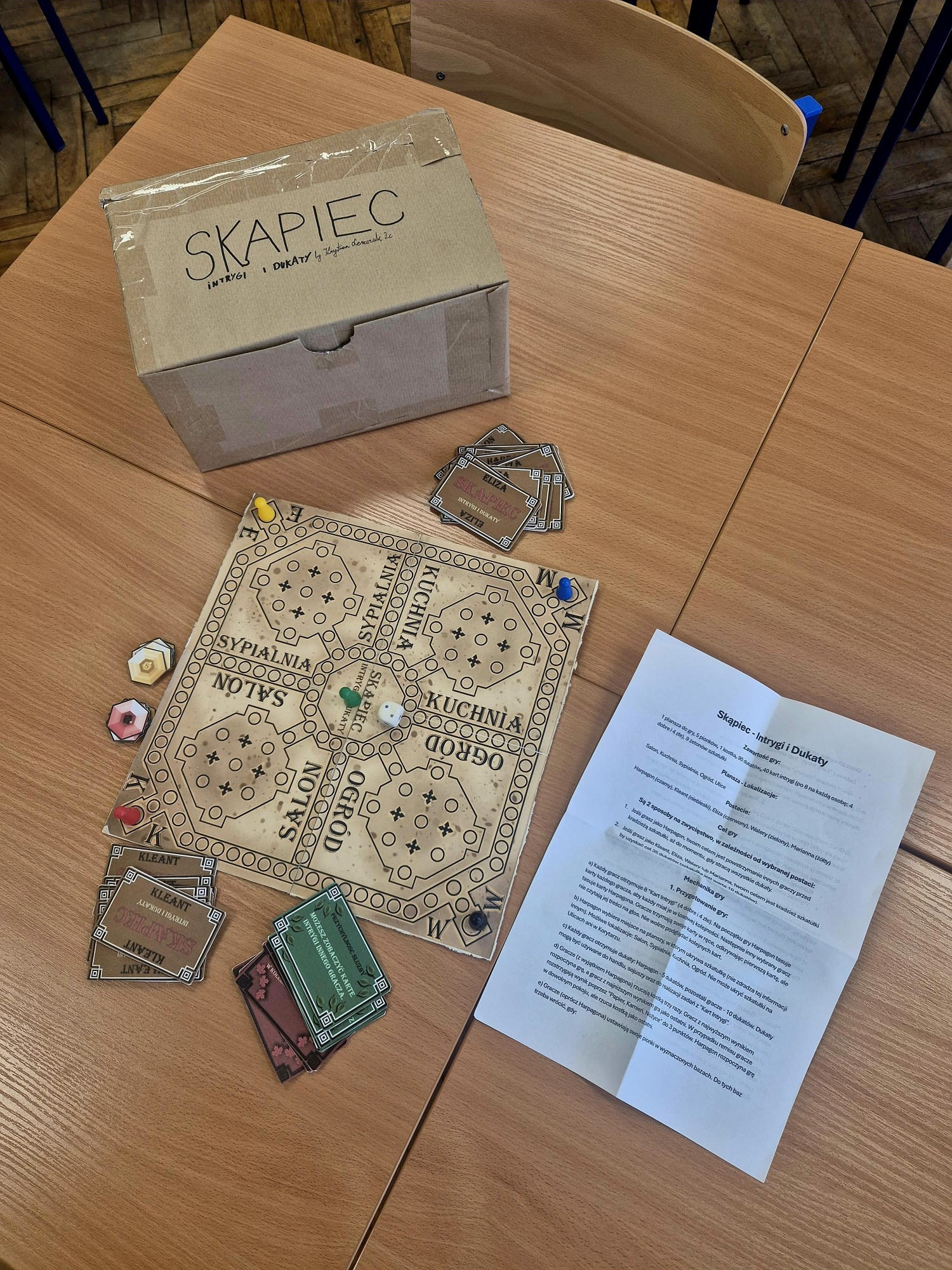 – grę planszową „Skąpiec. Intrygi i dukaty” (autor: Krystian Leszczuk z 2c)