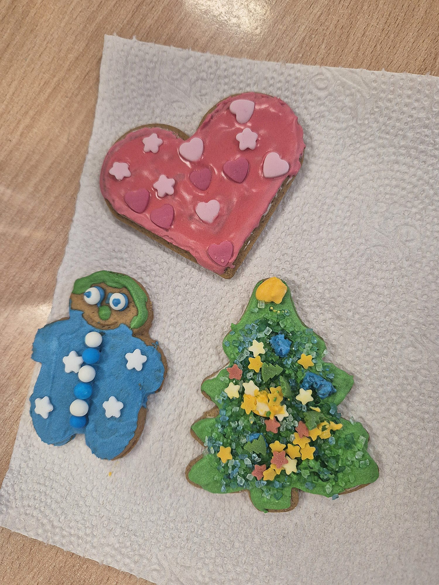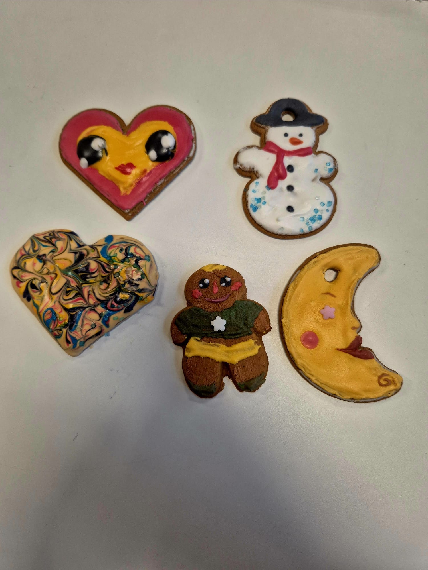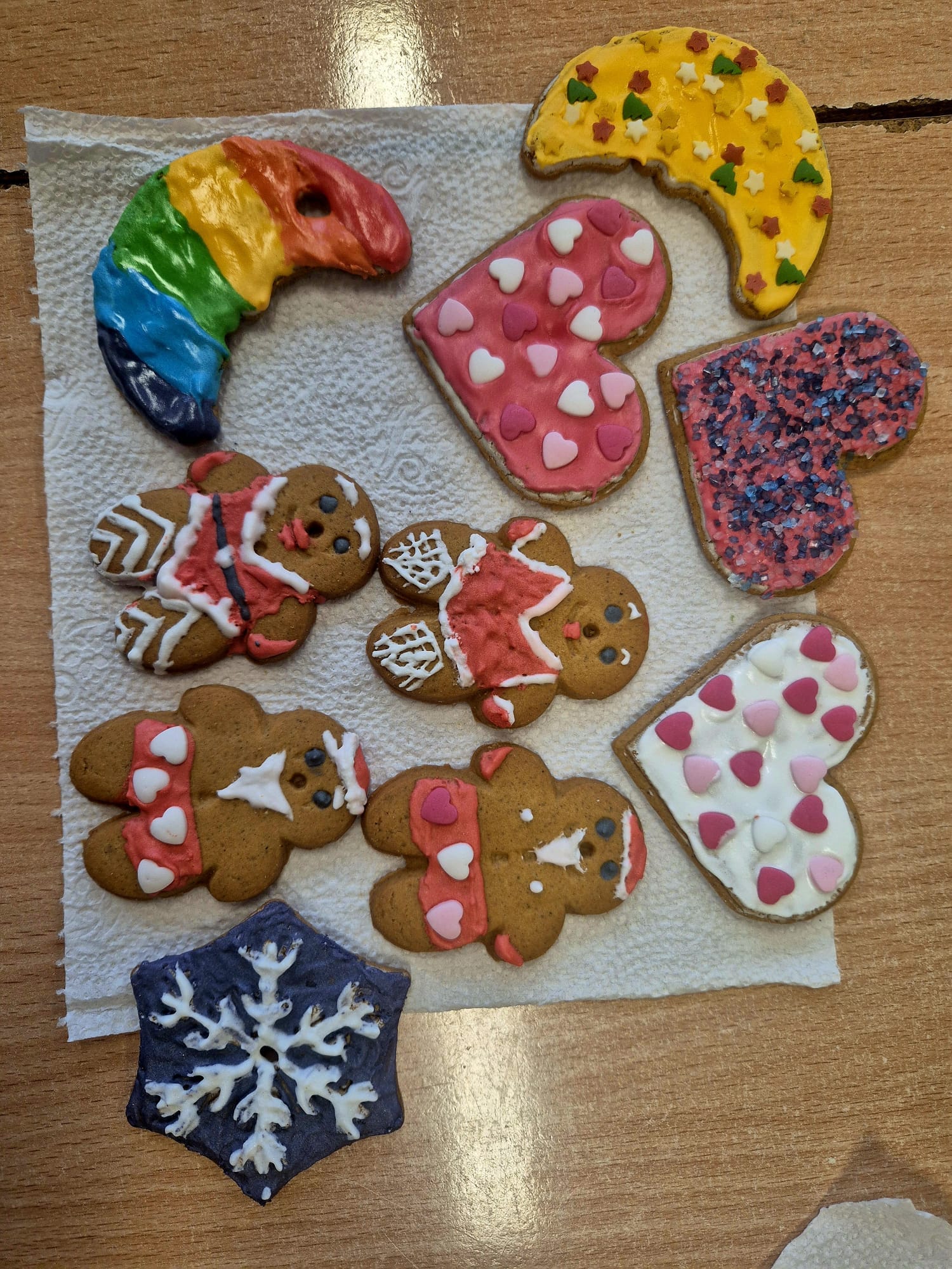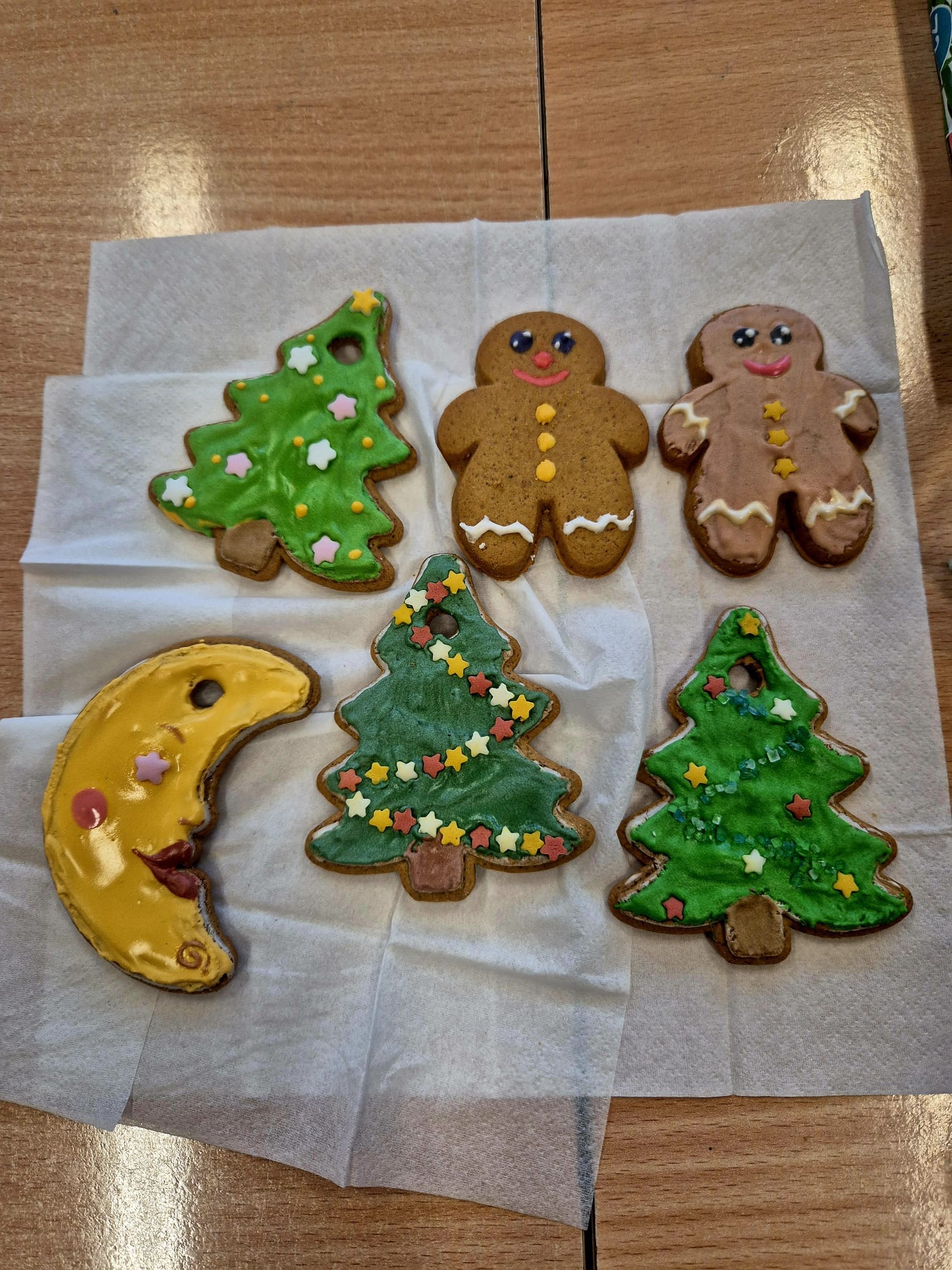 Uczestnicy świątecznych warsztatów pierniczkowych pod opieką p. Anity Nossek i p. Haliny Kubickiej zajmowali się lukrowaniem pierniczków oraz wykonali świąteczne opakowania na te wyjątkowe ciasteczka. Podczas naszego spotkania powstały kolorowe serca, słodkie choinki oraz piernikowe ludziki w wielu odsłonach.