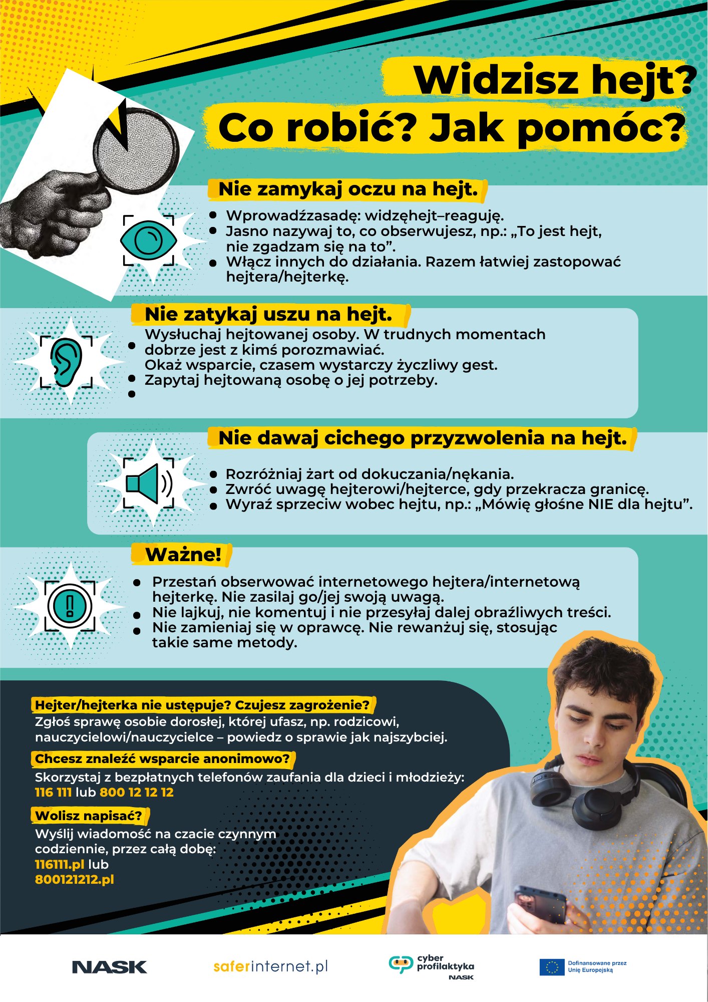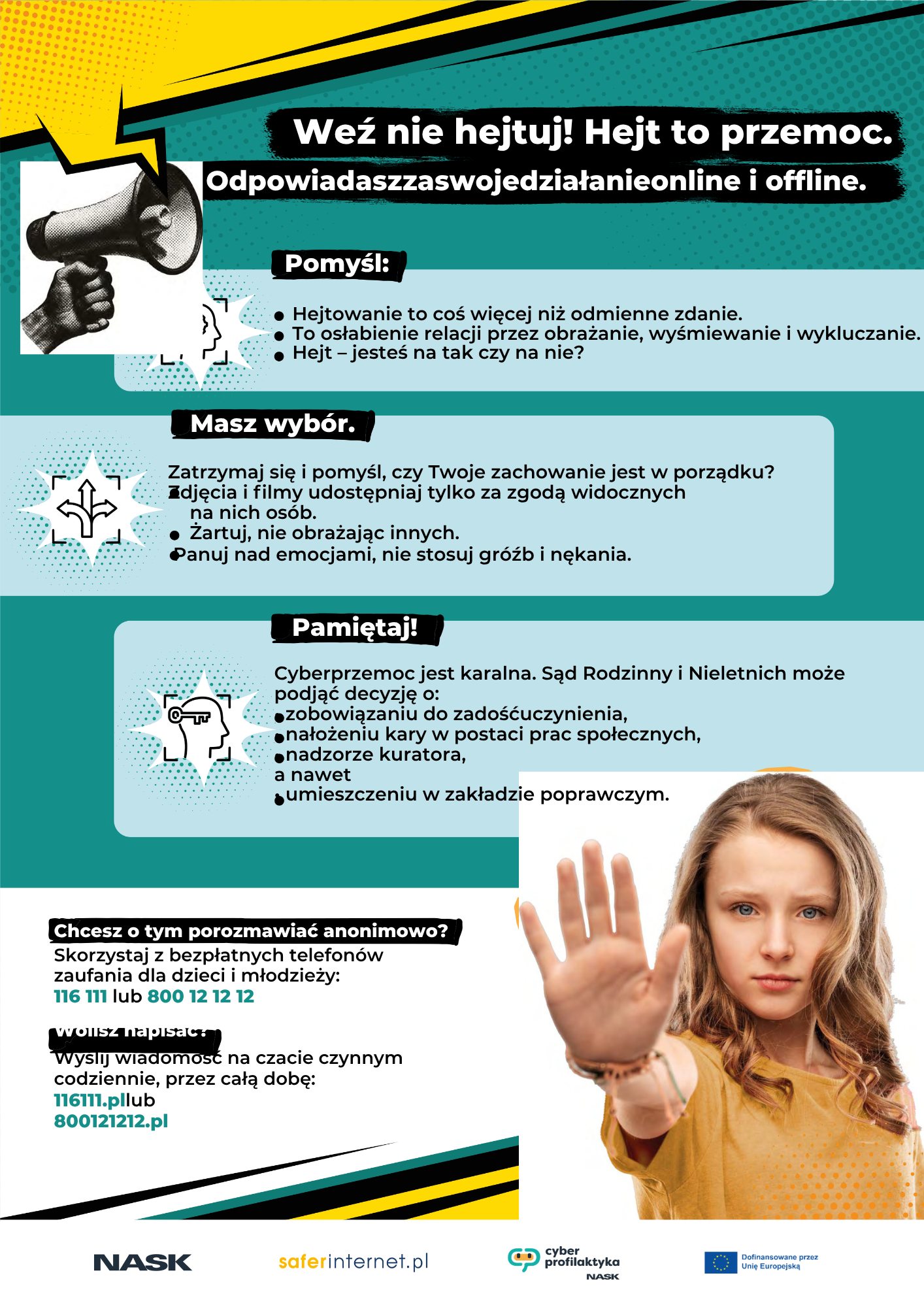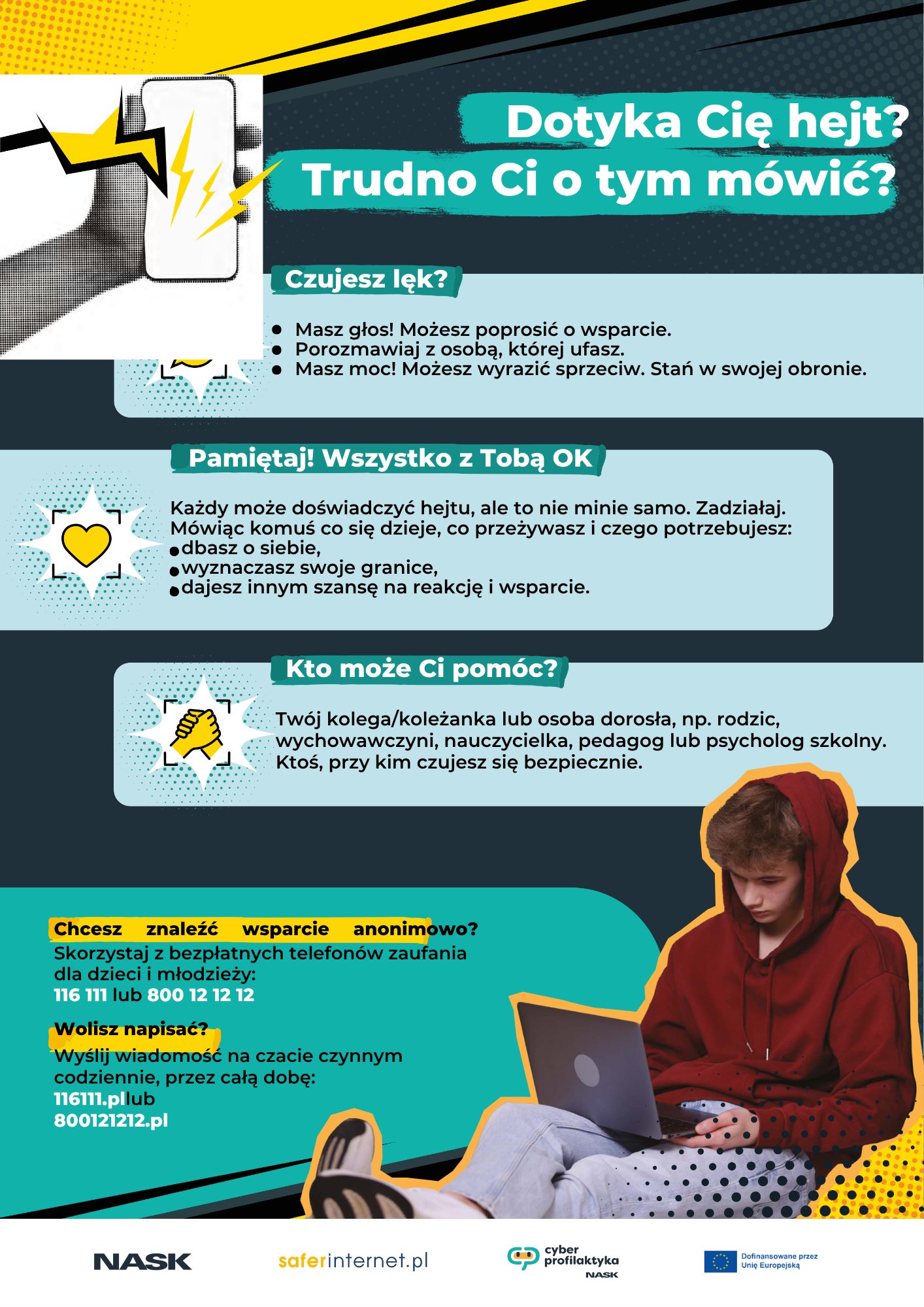 Młodzież miała możliwość porozmawiać z psychologiem oraz animatorem – ekspertem z zakresu cyberbezpieczeństwa o tym, czym jest hejt, jak wpływa na ludzi i gdzie można znaleźć bezpłatną pomoc. Uczniowie wymyślali antyhejterskie hasła, mogli też posłuchać prelekcji „Nuda a hejtowanie” oraz „Jak fejki nakręcają hejt”. -