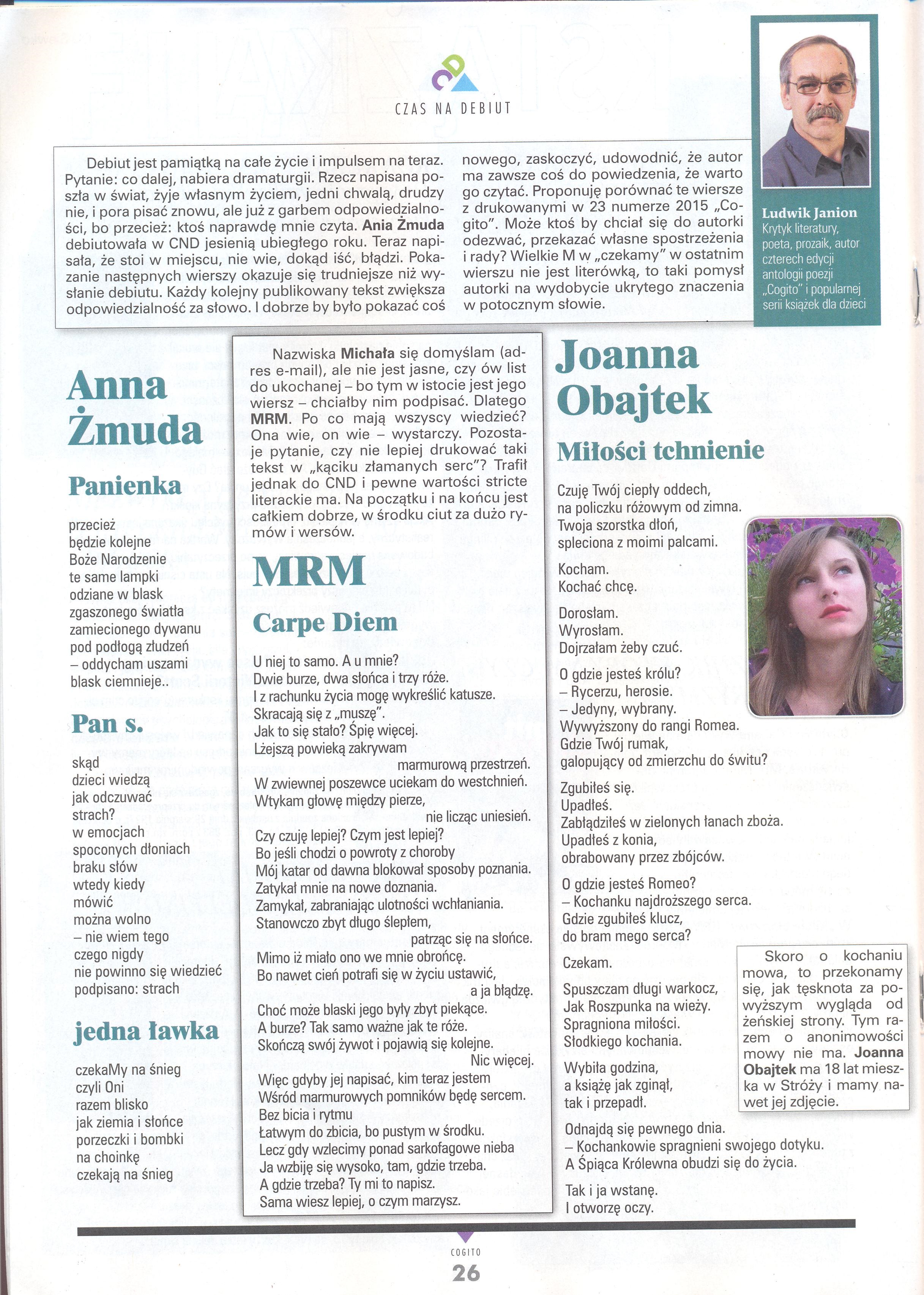 Zachęcamy do sięgnięcia po 5. numer dwutygodnika dla młodzieży „Cogito”. Znajdziecie w nim kolejne wiersze Ani Żmudy, uczennicy kl. 4dt. Wszystkich zainteresowanych zapraszamy do podzielenia się własnymi spostrzeżeniami na temat tych utworów lub sięgnięcia po inne poezje Ani, dostępne w bibliotece szkolnej.