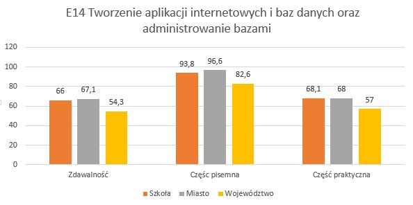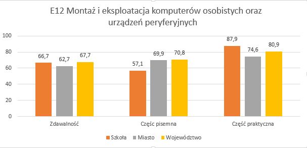 Zdawalność egzaminów zawodowych (nowy egzamin – technik informatyk, kwalifikacja E.12 i E.14 na wykresach poniżej):