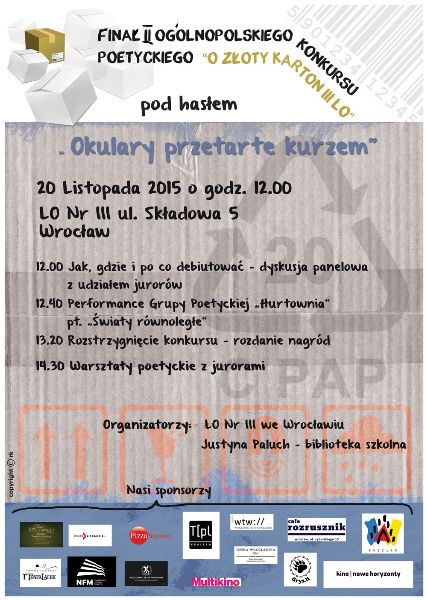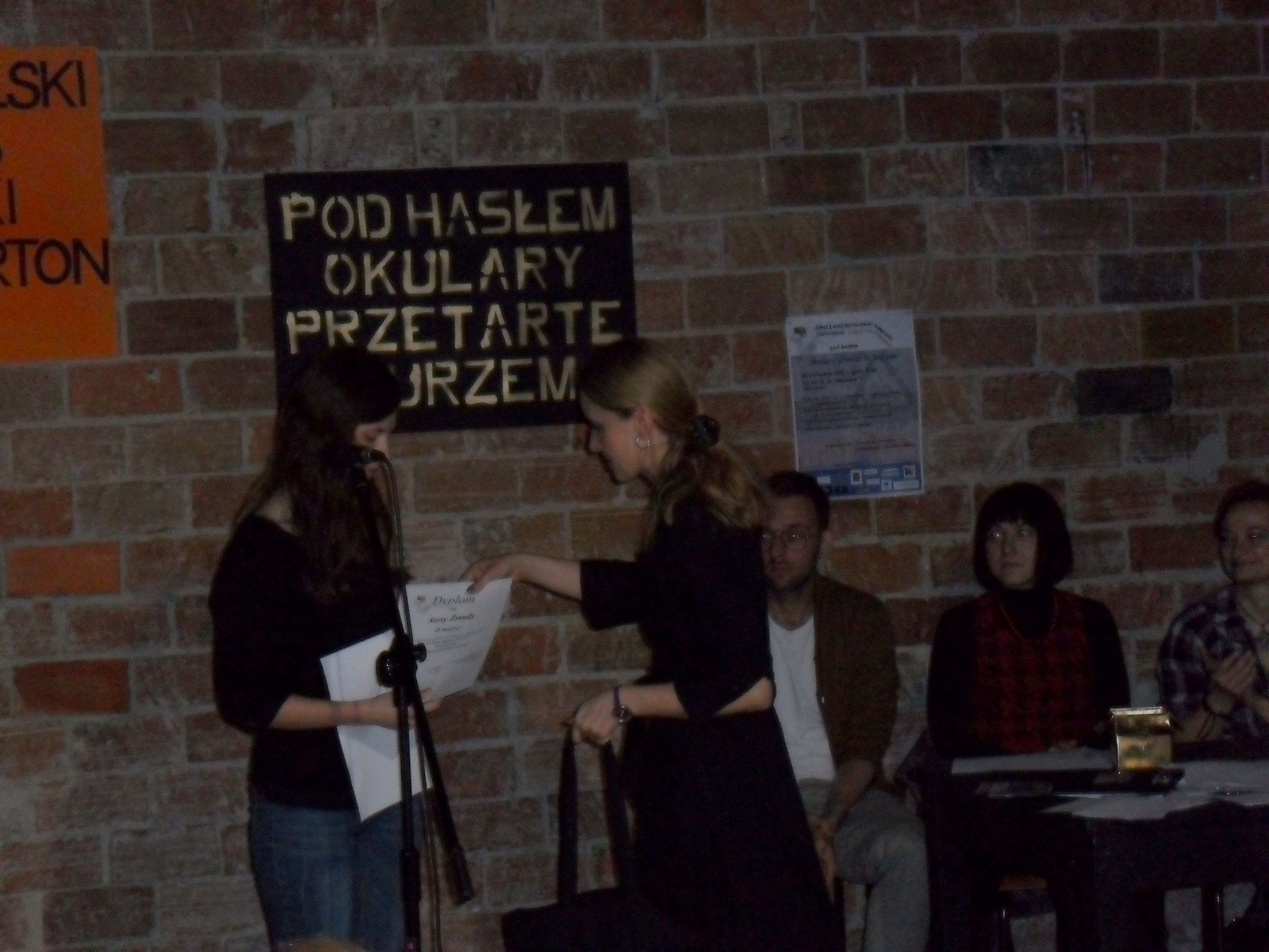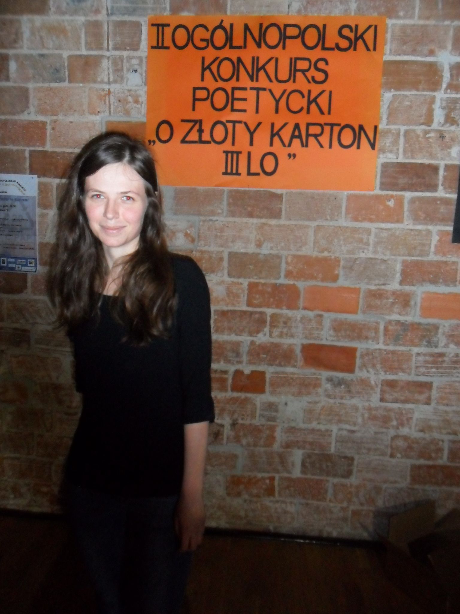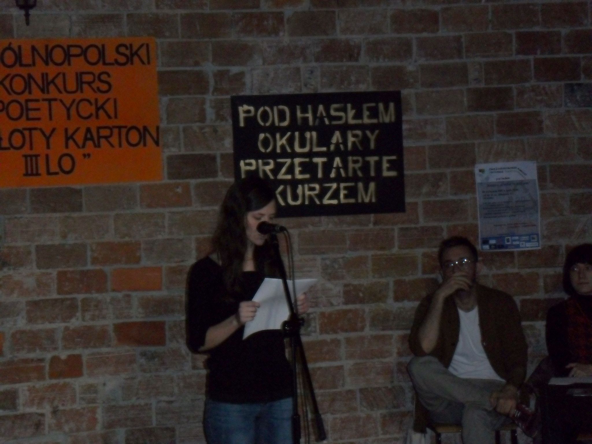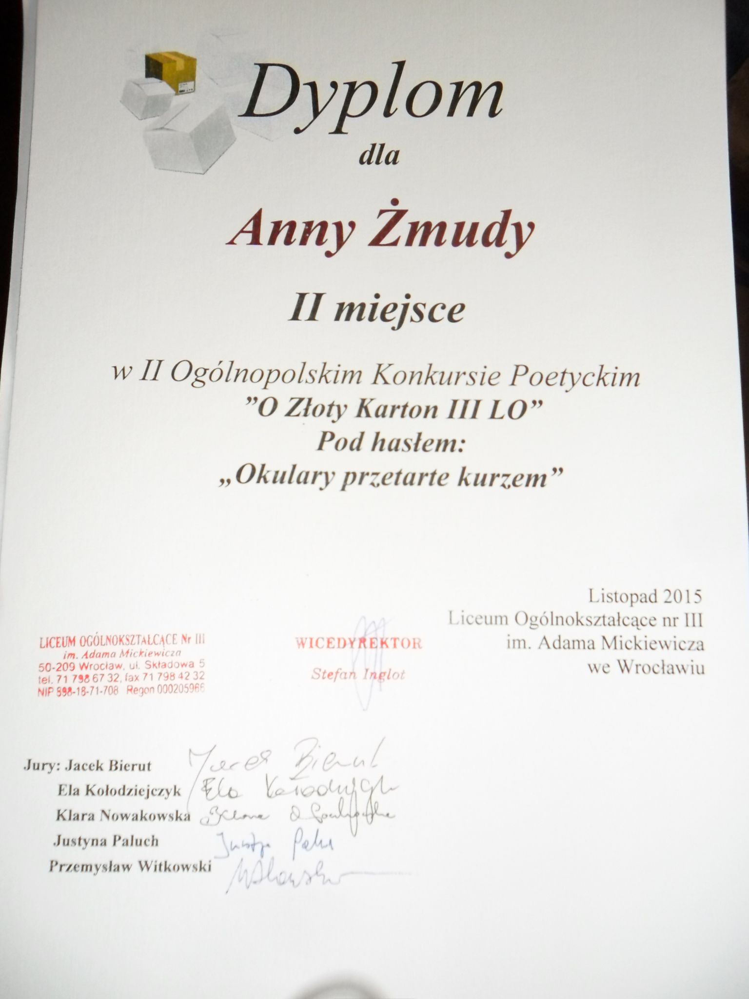 Ania Żmuda, uczennica kl. 4dt, zajęła II miejsce w Ogólnopolskim Konkursie Poetyckim – O Złoty Karton III LO „Okulary przetarte kurzem”. Prace młodych twórców oceniali wrocławscy poeci, m.in. Jacek Bierut, Przemysław Witkowski i Elżbieta Kołodziejczyk. W piątek 20 listopada Ania wzięła udział w uroczystym spotkaniu laureatów, którzy nadesłali swoje utwory z odległych zakątków Polski, m.in. z Białegostoku i Tarnobrzega. Serdecznie gratulujemy Ani kolejnego sukcesu i zostawiamy Was z jej wierszami!