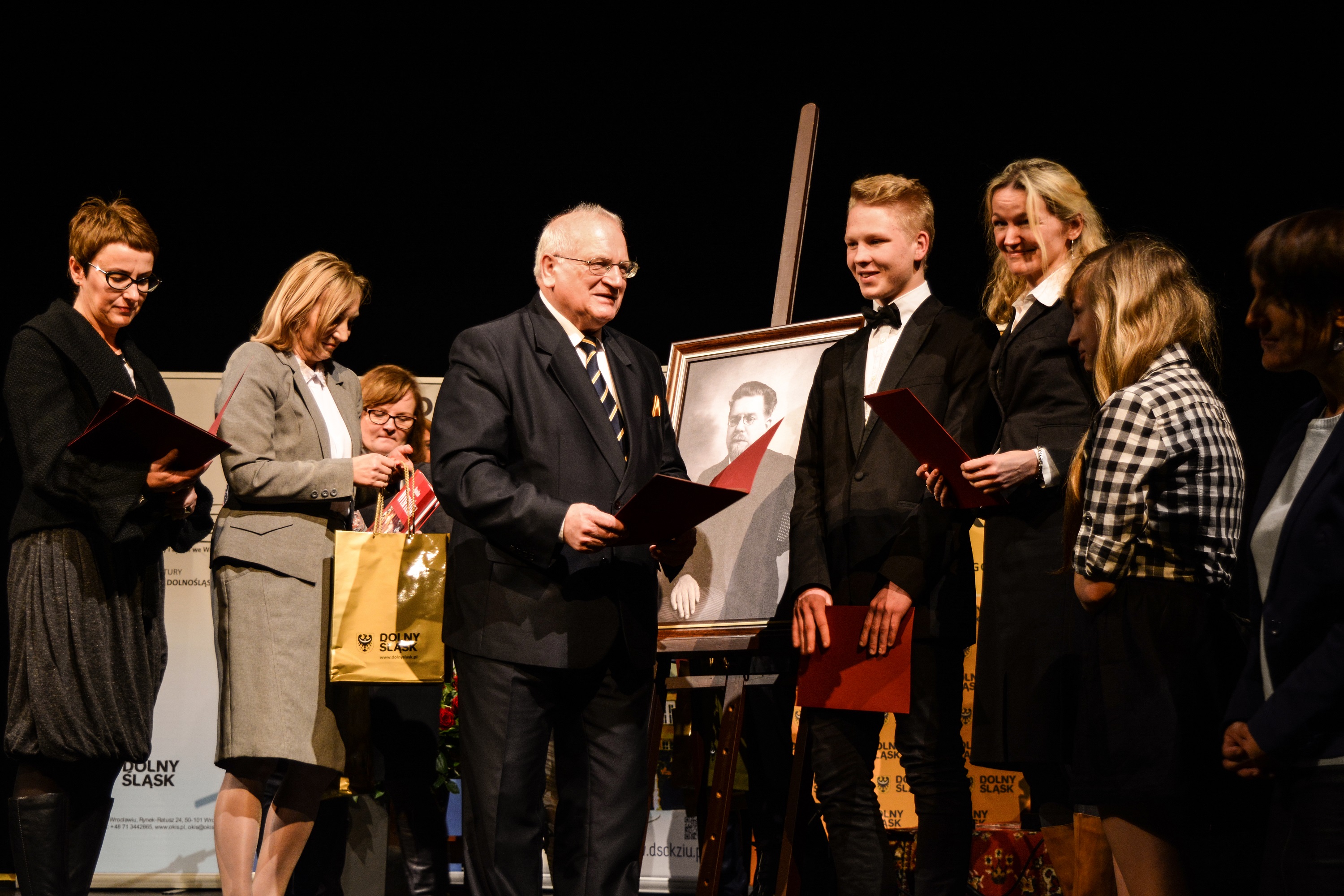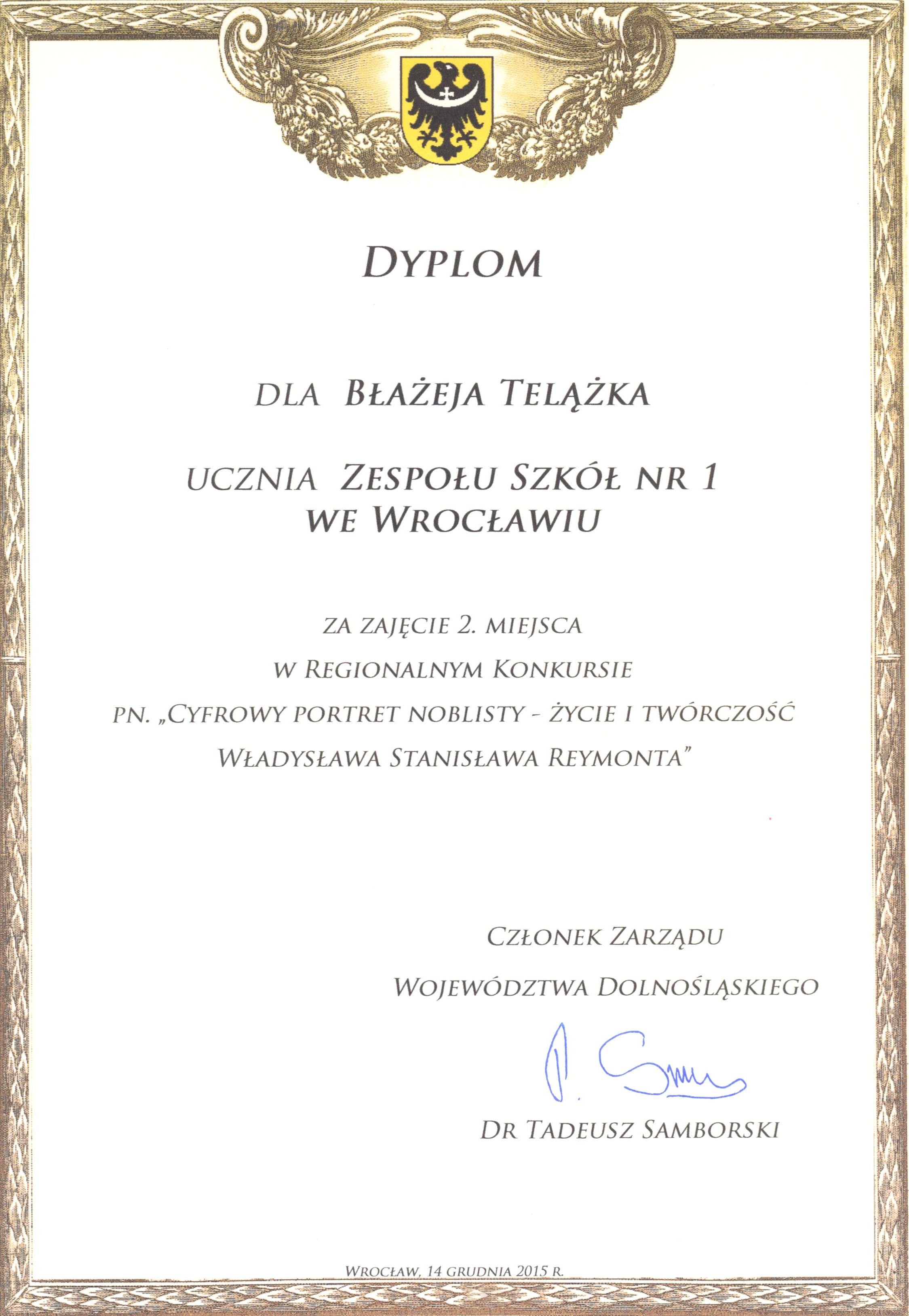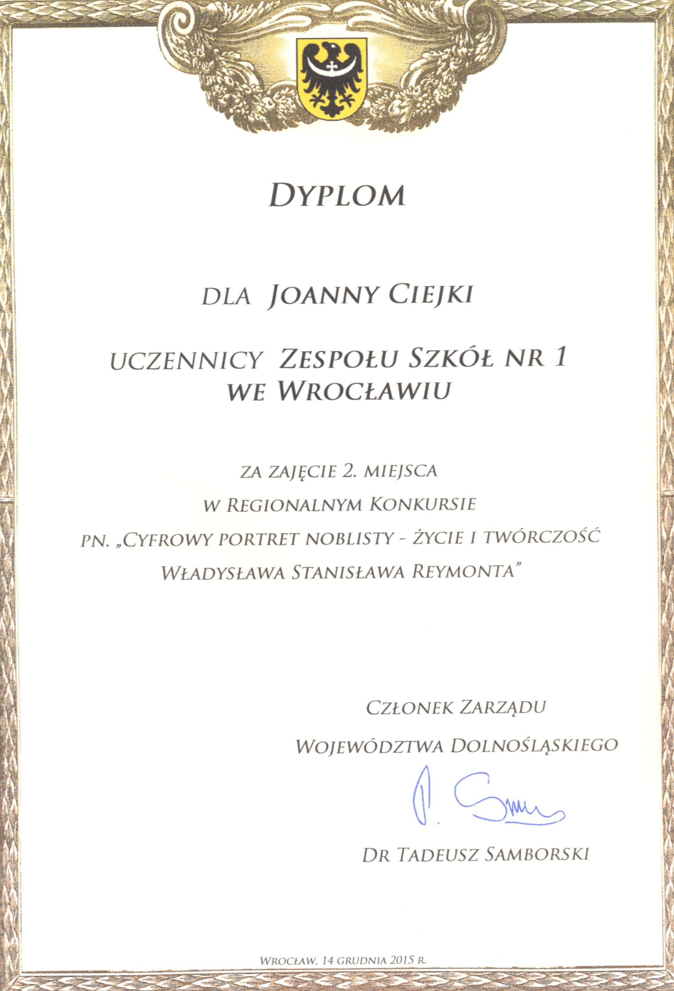W poniedziałek 14 grudnia w Legnicy uczeń kl. 2c Błażej Telążka odebrał II nagrodę w konkursie "Cyfrowy portret noblisty" w imieniu swoim oraz koleżanki z zespołu Joanny Ciejki. Gala wręczenia nagród odbyła się w kameralnym, stylowym Teatrze im. Heleny Modrzejewskiej podczas konferencji poświęconej życiu i twórczości noblisty Władysława Reymonta. Czas spędzony na spotkaniu był okazją, by lepiej poznać tego nietuzinkowego pisarza, kojarzonego przez młodzież przede wszystkim z powieścią "Chłopi". Jeszcze raz dziękujemy wszystkim, którzy wzięli udział w głosowaniu konkursowym na Facebooku na pracę Błażeja i Asi. Prace wszystkich laureatów można obejrzeć na stronie: http://www.dbp.wroc.pl/biblioteki/wroclaw/aktualne-wydarzenia/konkursy#prace-laureat%C3%B3w