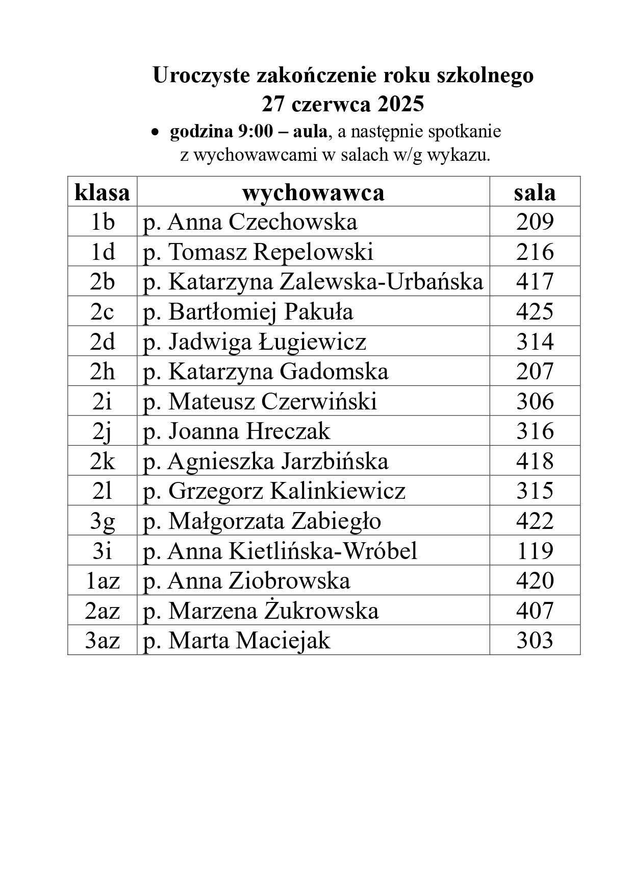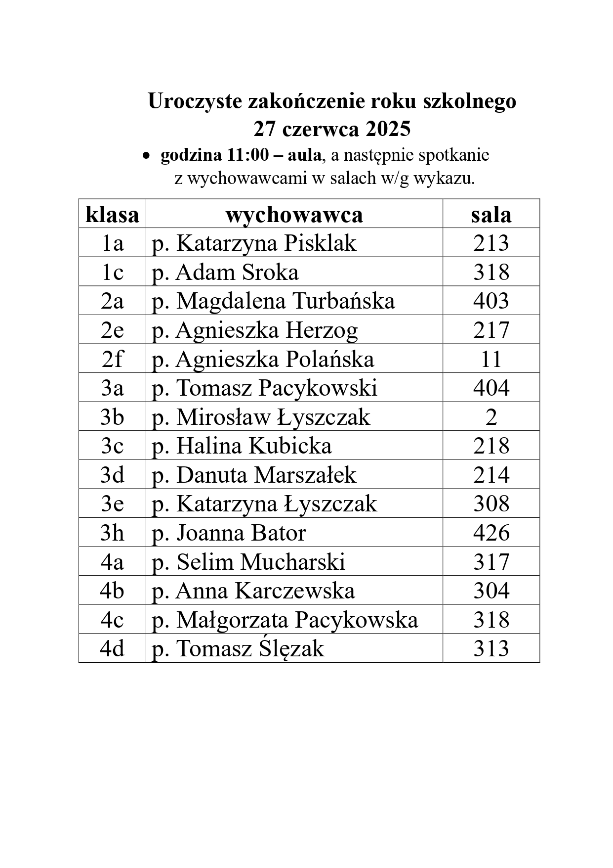 | klasa | wychowawca | sala |